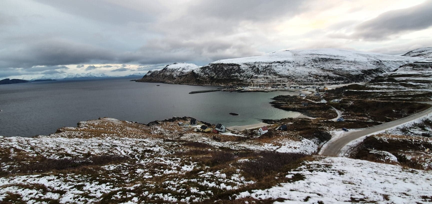 Brevik og Breivikfjorden i sør, med Hasvik og fjellene rundt bak.