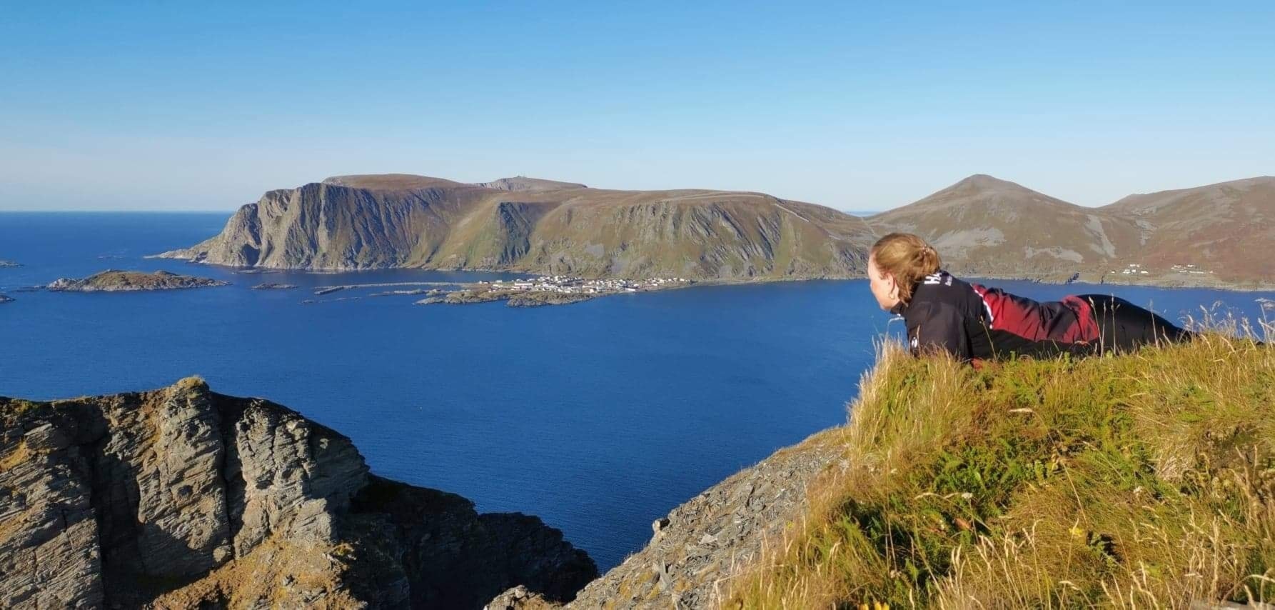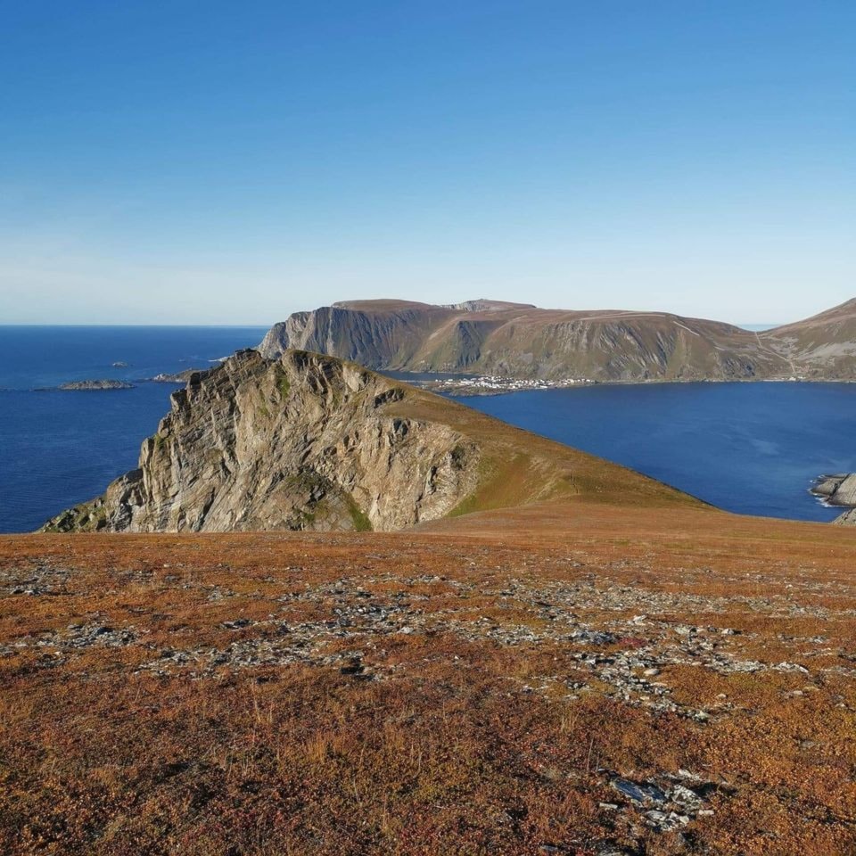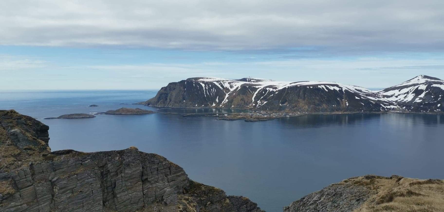 Utsikt/Hva ser man herfra: Ved klippskilt på Prestberget har du en mektig utsikt over Sørvær i nordvest, og hele fjellrekka (fra venstre mot høyre) Soppen, Oksåtra, Skjolden, Skjeppe, Fossbakken, Finnkjerringa og Andotten. Du ser ned til Lille Mollvika og Markeilvannet (som du passerte på tur opp). Utover sjøen er det hav så langt du ser.